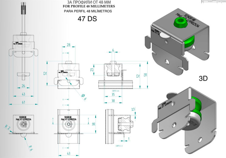 Model for profiles 45/47 mm. The model is designed with acoustic insulating arms made of high quality polymer with high resistance (MEGOL - IA30 and 35 C-UG / UVI F / 61 - P1250SPE). According to UNE EN 13964.