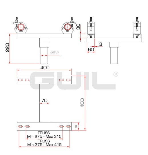Description:ADJUSTABLE TRUSS ADAPTOR FITTED WITH 4 ALUMINIUM COUPLERS & A Ø 55 mm SPIGOT. FOR TRUSS FROM 290 TO 400 mm
