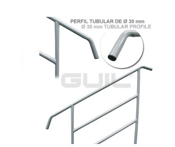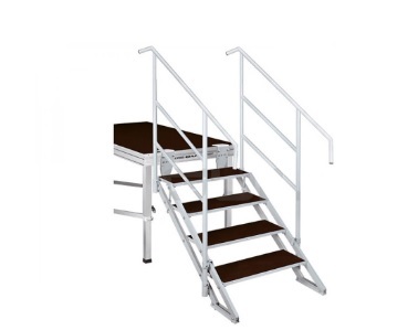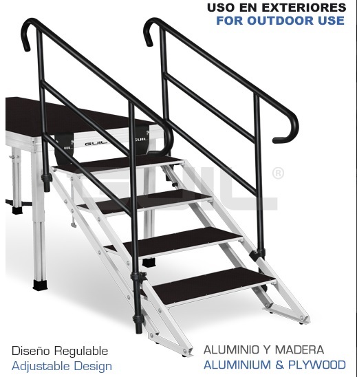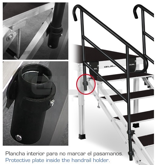 It comes complete with a set of two aluminium modular handrails (ref. PSA-05) made with Ø 35 mm tubes. They have two reinforcing bars and come with all connectors needed for a quick and reliable attachment to the stage.