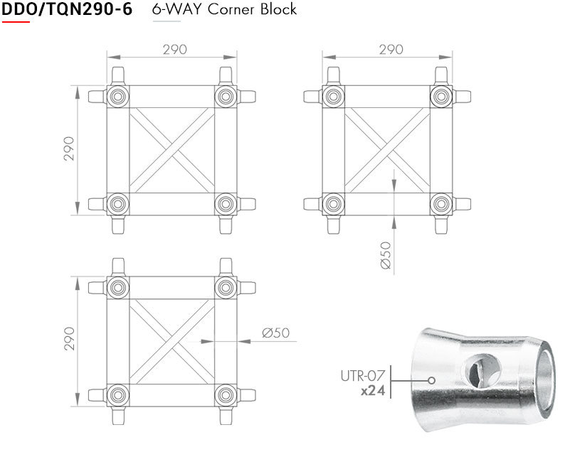 The DDO/TQN290 six-sided box corner allows multiple configurations to be created using as many sides of the cube (2, 3, 4, 5 or 6) as needed. By simply screwing more connectors (ref. UTR-07) to the selected additional side, more usable sides can be added as required by your setup.
