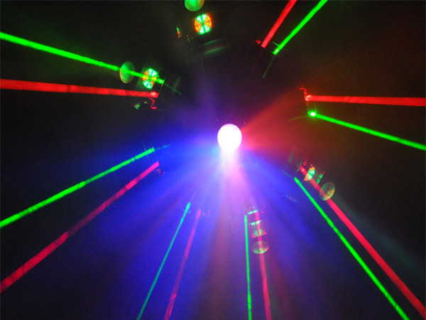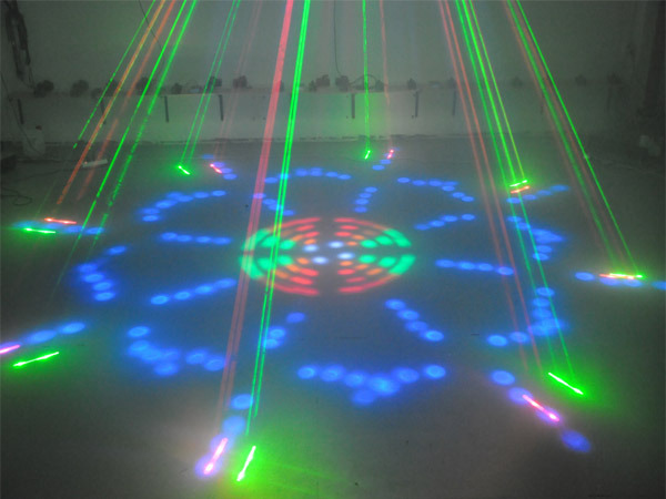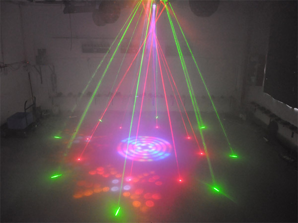 Description: This hefty beam is a modern combination of number 16 RG lasers, 8 LED lights and LED flexible powerful in the middle, covering over 120 ° from the scene. Only this light is enough for the big stage. Laser grid can show many effects, such as laser curtain color laser selection, blinking, rolling ray scattering, speed, choice of location. Eight (8) powerful LED lights have the functions of selecting colors, speed and choice of position. LED lighting can be shown in automatic and active mode. They are switched off after stopping the sound system. LED light in the middle is the largest effect, which has a function to control the speed, direction of rotation and color selection. All laser and LED lights can be controlled separately via DMX controller.