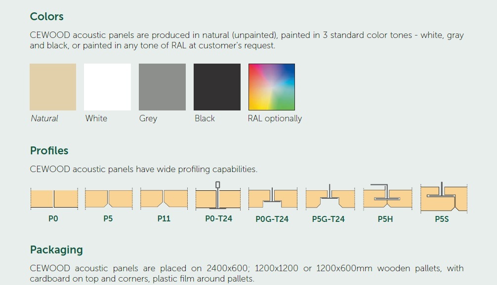 CEWOOD acoustic panels are produced in natural (unpainted), painted in 3 standard color tones - white, gray