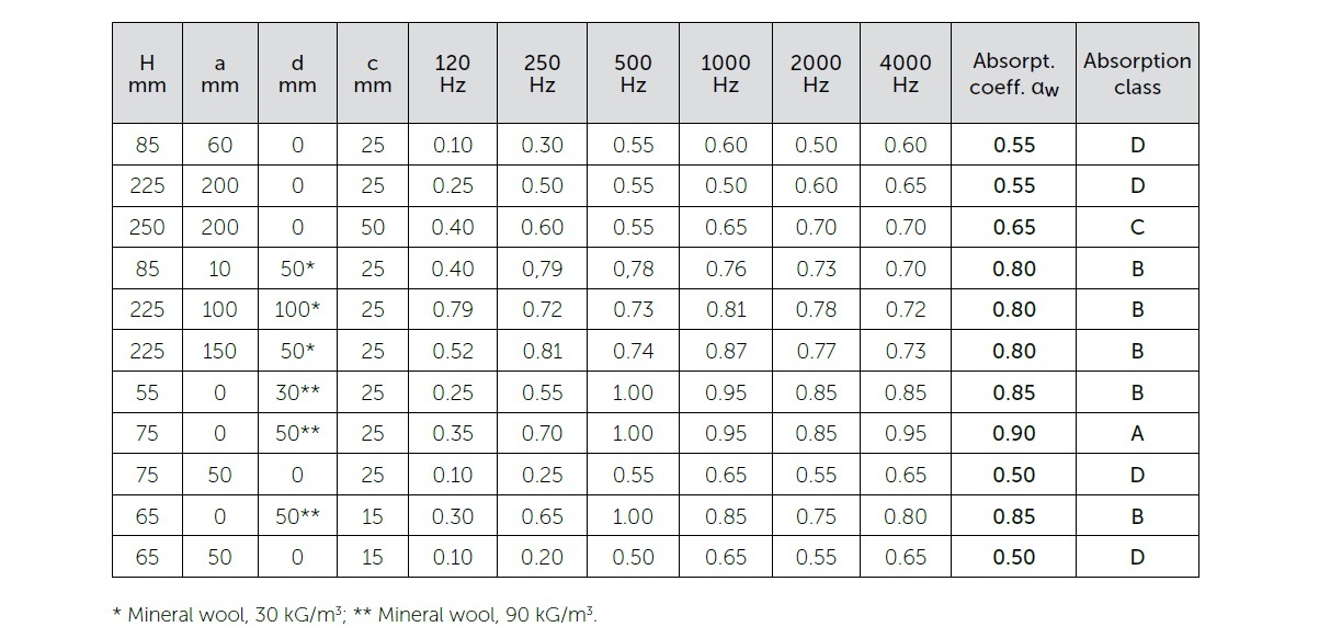 With di erent fastening constructions and combinations of di erent materials with CEWOOD acoustic panels it is possible to achieve di erent sound absorption parameters. The extended sound absorption coe cient w can reach 0.90.
