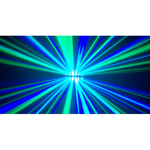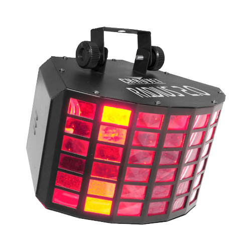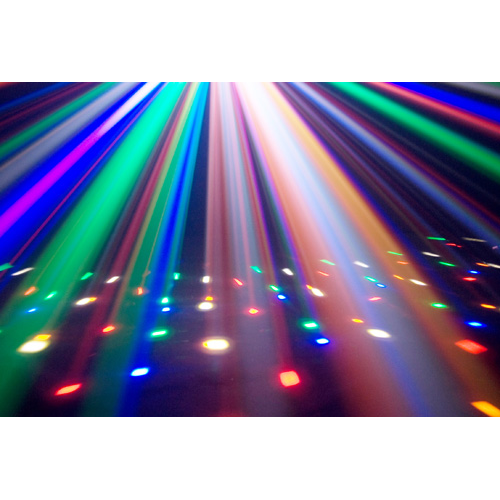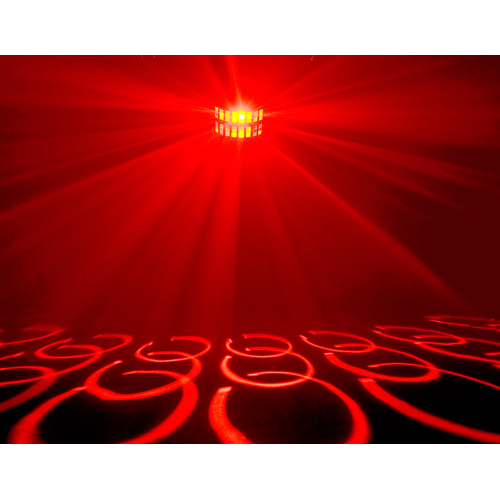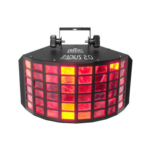 Radius 2.0 is a LED light effect that creates multicolored, overlapping rings of light with 3W red, green, blue, amber and white LEDs. This LED-go product offers variable electronic strobe in any color combination and independent control of each color. Variable speed motor control movement back and forth. Built-in sound and automated programs, DMX control.