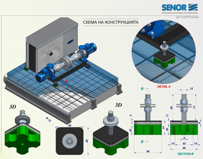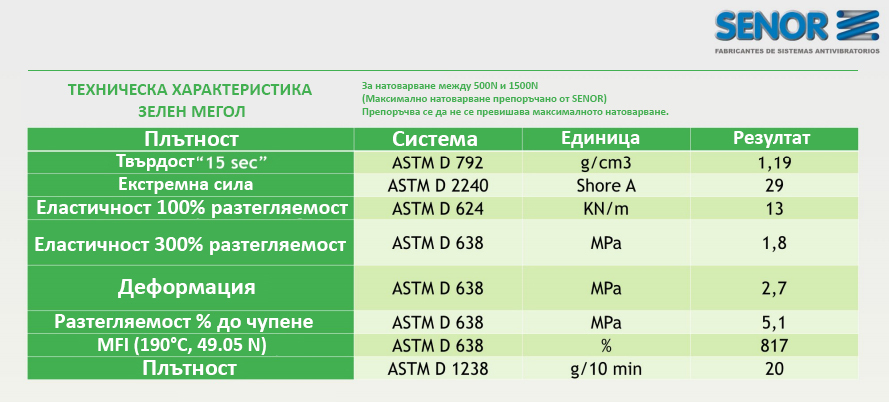 Description: Exceptional quality in compact construction. Nowadays the installation of industrial machines in cities exacerbates the problem of noise above the acceptable sound threshold. The structural noise or vibrations produced by this type of equipment - air conditioners, compressors, motors, heat pumps, etc. whether general or individual, they cause vibrations, shock and noise, which are transmitted to the structures of buildings and affect the quality of life in them. Silencing insulation damper ACV + MEGOL is the latest generation AV damper with an exclusive design for vibration isolation of machines. SENOR's exclusive product. This system is designed to eradicate and reduce the transmission of vibrations caused by knocking, knocking, shaking, similar sounds or vibro energy - mechanical sounds from a technique that causes harmful or irritating noise levels above the permissible sound threshold. (20Hz) Test on dynamic response index and strain curve. The test can be traced from the attached photos. Determination of the natural frequency (Hz) and deformation values for different damper loads. Calculations are made for each load level between 0-100Hz for a given acceleration level (0.2g). Placing an accelerator on a solid part of the structure that serves as a control and another at the point of action of the damper makes it possible to determine the result of the quality of operation of the damper.