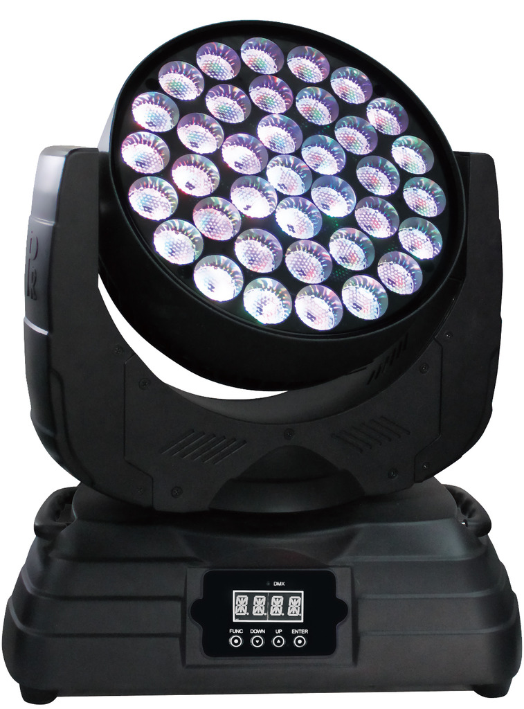 Description: Super bright XLED 1037 is a new product series "moving heads" of PR Lighting. It is characterized by the use of a 37 x 10 Watt RGBW LEDs (containing four colors in one), another important feature is its wide linear "zoom" with an angle of the beam in the range of 13 ° to 52 °. Additional features include - alinear CTO from 3200K to 10000K, linear mix of colors with macro function, 0-100% linearly adjustable electronic strobe (0 to 25fps). In terms of movement, XLED 1037 offers adjustable speeds (horizontal angle of 0 ° -540 ° and a vertical angle of 0 ° -270 °) with automatic correction function of the position. It also allows for automatic adjustment of the fan speed adjustment of brightness and contrast and can boast an advanced cooling system, nepregryavashta LED lamp and DMX 512 control display. There are various control options, as XLED 1037 is compatible with Wireless DMX.