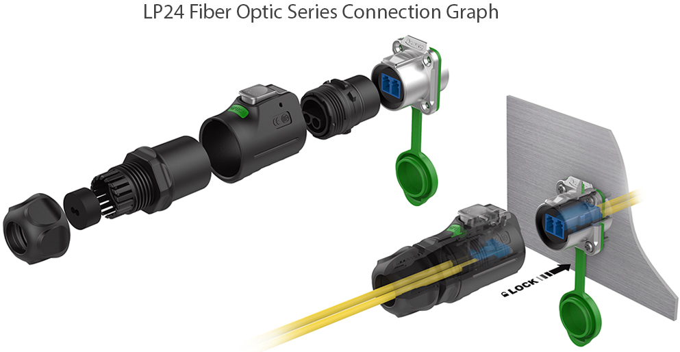 Description:The LP-24 Series fiber optic connectors LC type with hole size 24mm meet different needs of industry with low and stable contact resistance and apply with International environment protection of Industrial equipment as well. These connectors feature high-frequency noise immunity and electromagnetic interference protection. The quick plug design and snap-fastener lock make it easy and simple for quick connections.