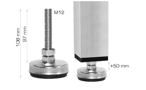 Description:Fixed height leg with square profile of 50 x 50 mm manufactured with extruded aluminium. This removable leg is provided with a stainless steel threaded bolt that has a non-skid rubber foot pad (adjustable by 50 mm), ensuring a perfect fit to any surface.
