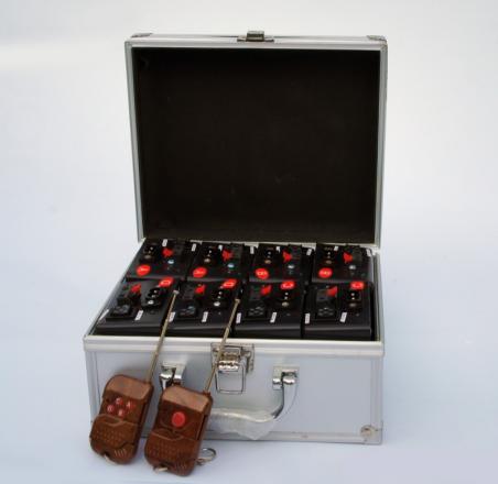 Description: Small and compact fuel system with remote control for the Performing fountains. The system consists of eight (8) the number of launchers with rechargeable batteries on board the launcher for easy wireless start, two remote transmitter, a cable for charging the batteries and fly case.