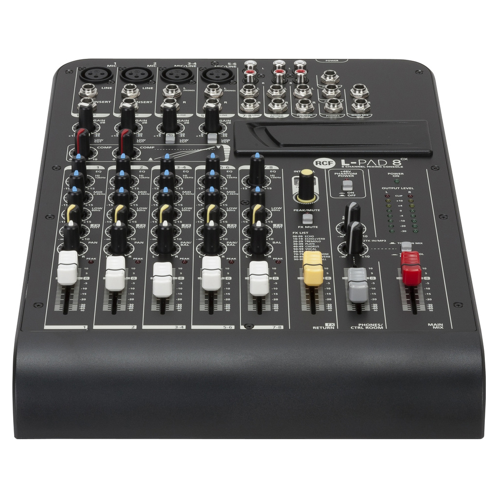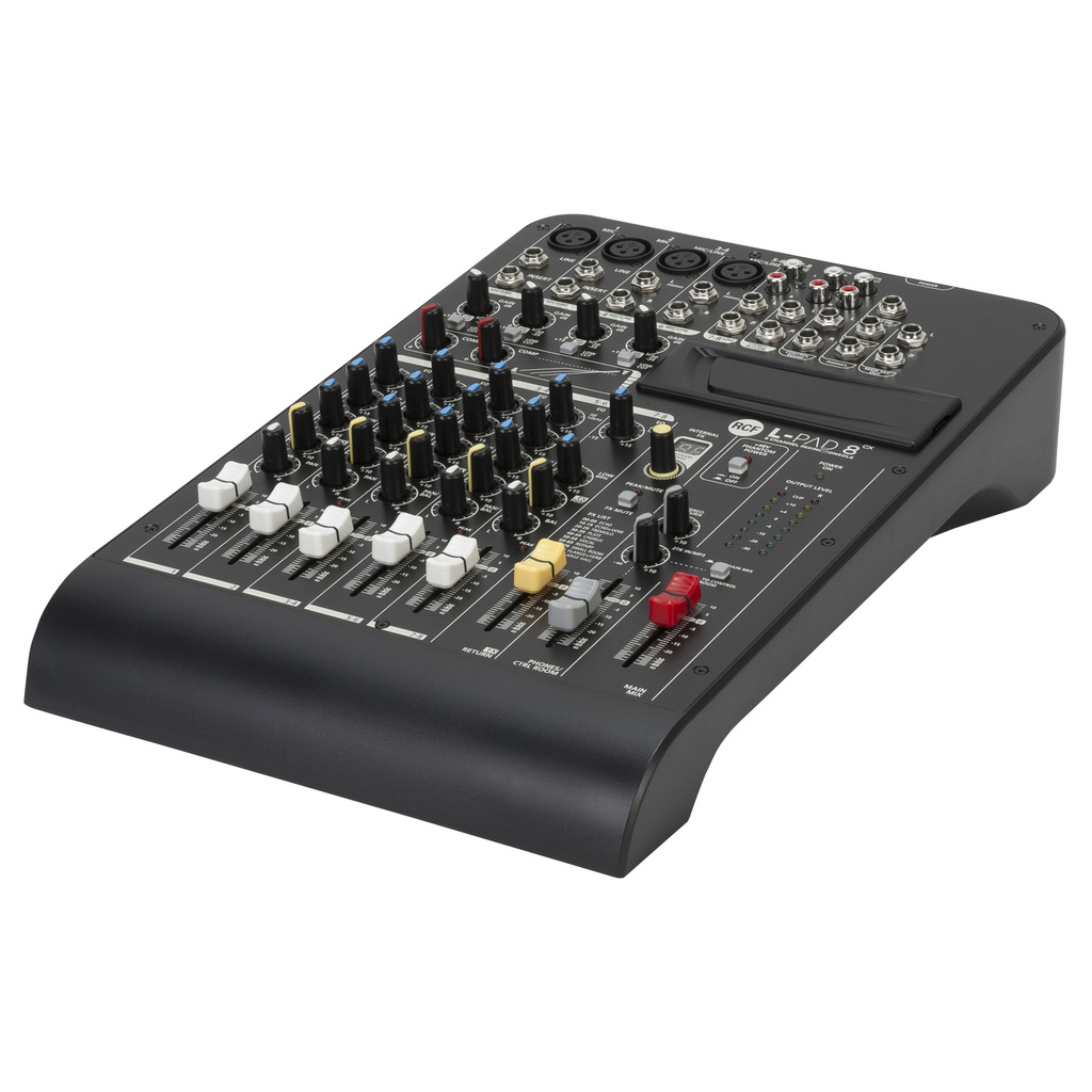 Description: With four transparent sound mic inputs, three stereo line inputs and the 2tk in/ out, L-PAD8CX is the ideal tool for duo/trio gigs, speech, background music diffusion and parties. Two single-control compressors on mic channels help to handle even the more dynamic complex signals. The 99 preset Internal FX DSP allows the sound to be improved by adding accurate and warm effects. The super versatile L-PAD slot permits the optional L-PAD MP3 PLAYER, PLAYER/RECORDER or BLUETOOTH CONNECTION cards to be inserted for even more flexible use. Thanks to the accurate Italian design L-PAD8CX is easy to grab, transport and handle in all the situations.