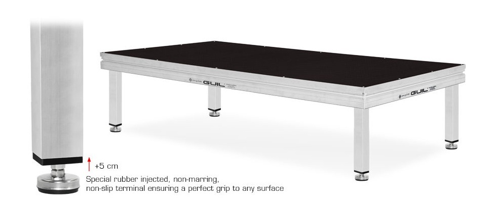 The TM440, TM440XL & TM300 stage podiums have a quick and easy method of attaching the legs. The aluminum sockets for the legs hold them firmly in place with a metal pressure knob (ergonomic design), which ensures optimal attachment to the frame.