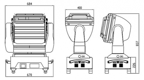 Description: Architectural outdoor floodlight Mega Colour 2500 PR Lighting, lamp PHILIPS MSI 2500W, DMX control 11 channels. Color mixing is done smoothly by CYM system. Adjustable speed of Pan and Tilt. Device for protection against overheating. Perfect projector for color accentuate the modern and historic buildings.