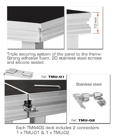 The TM440S Deck has a strong frame made with special extruded aluminium profiles (alloy EN-AW 6082 T6 in accordance with UNE-EN573). Its continuous rail design guarantees a quick and easy platform connection, allowing easy attachment of a wide range of accessories: access stairs, safety rails, stage skirting, etc.