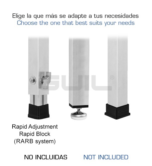 Standard legs with square profiles of 40 x 40 mm are manufactured with extruded aluminium (Alloy: EN-AW 6082 T6). These removable legs are provided with special non-marking non-slip terminals guaranteeing total adjustment to any surface.