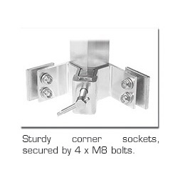 The leg sockets are made in sturdy aluminium and each one is fixed to the profiles by means of 4 bolts and self-locking hex nuts; guaranteeing maximum strength and durability. The legs are quickly and easily secured into the sockets by an ergonomic metal knob; which also guarantees maximum safety and total durability.