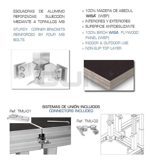 Our lightweight but resistant modular platform, certified to withstand up to 500 kg/m² (2x1m: 1000 kg Uniformly distributed), consisting of a sturdy aluminium frame (Alloy: EN-AW 6082 T6) and a non-slip, water resistant phenolic plywood panel, includes 2 connectors: 1 x TMU-01 & 1 x TMU-02.