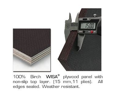 TM440S Decks have a 15 mm thick panel, made of best quality 100% Birch WISA® plywood panel (WBP), composed of phenolic resin coated layers, making them resistant to bad weather conditions and humidity.