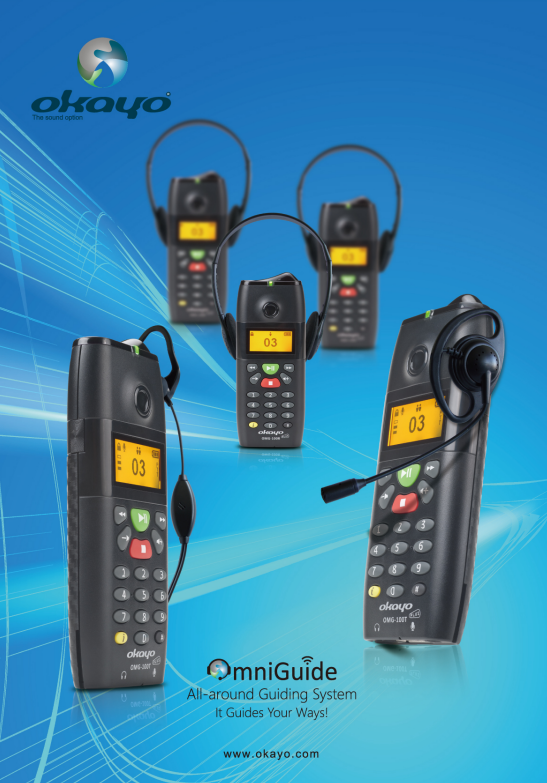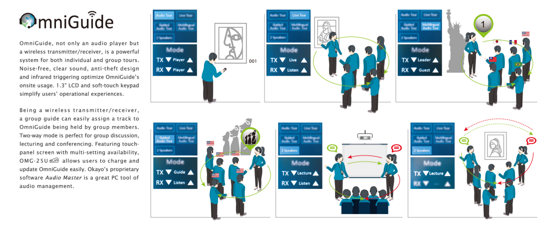 A wireless receiver/transmitter with which the group tour guide can easily set information to the device to be received by visitors' devices. Dual mode is perfect for group discussions, lectures and conferences. Powered by Okayo software, Audio Master is an excellent PC application for audio management.