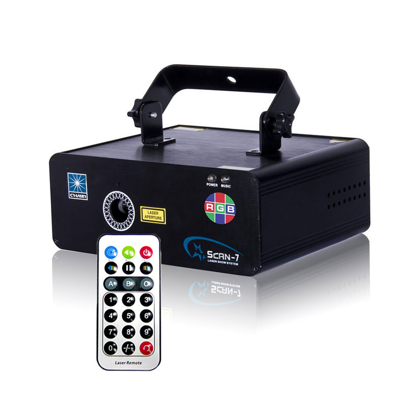 Professional quality animated RGB laser clubs and mobile DJ and 4 built shows multiple animations rays, graphics, etc. Combining three powerful lasers (red, green and blue) with high-speed scanners Scan-7 RGB 620mW produces a rainbow of colors and stunning effects, animation, antennas and others. It uses new '' multi-thread "of SCM control technique that allows the laser fantastic models, and can control up to 17 DMX channels. One of the nicest features is the free wireless remote control. There are more than 80 templates that include animated models, numbers, networks, waves, wheels, points and can be manipulated in a swirling, point, stretch and zoom movements via DMX protocol.