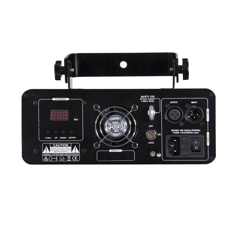 Control modes: 4 modes Auto Play, Auto Show, SOUND Active, DMX MODE, Master / Slave, Remote control, XY corrections and output size by DMX.