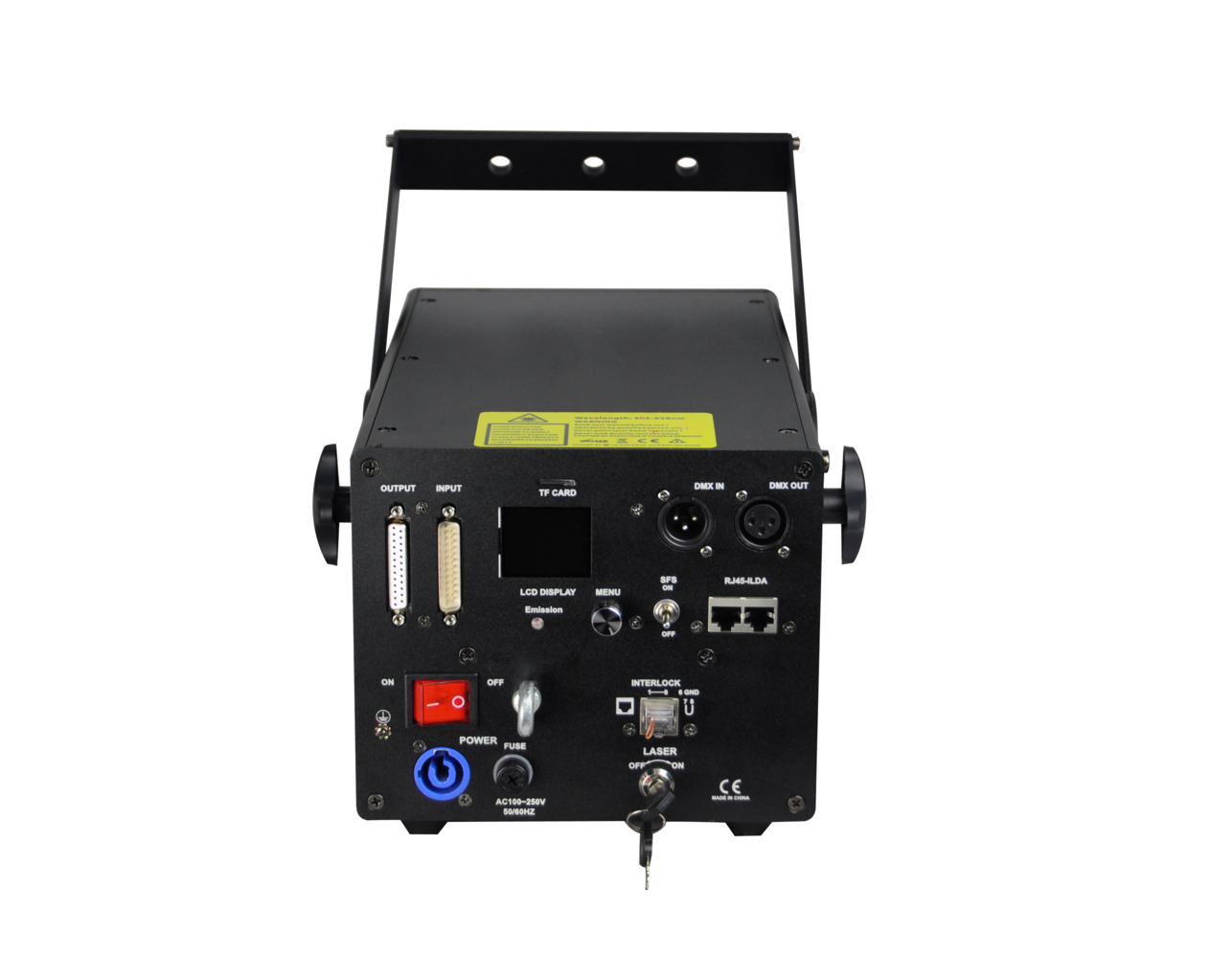 for high power laser lights), Power key switch, laser ON-OFF switch, laser remote interlock, flying rings bolt.