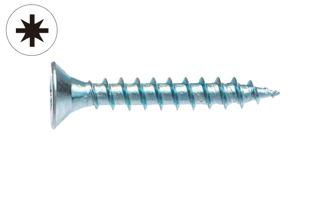 Description: Screw for wood and chipboard, with hidden head / double cutter / and fine wax coating.