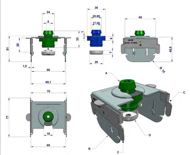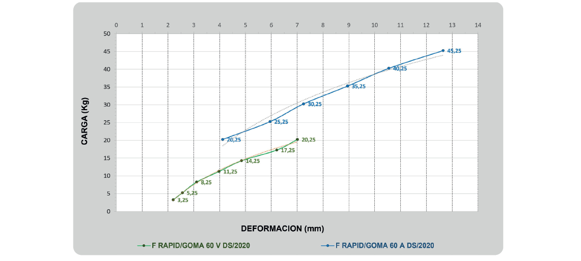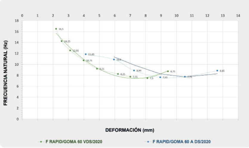 In the design of acoustic ceilings there is a very wide variety of design solutions, in which the load distribution depends on various variables, such as: mass m2, distance between the axes of the ceiling profiles, location of impact absorbers on the plate, etc ... Range 4360 / 47DS has the advantage to combine 2 colors to differentiate the load per unit (kg): GREEN and BLUE. The GREEN color will indicate the one with the lowest weight, between 8Kg to 30kg maximum load. and BLUE color, the one with the highest load, between 27 kg to 50 kg maximum load. In this way we can choose the most effective shock absorber depending on the system.
