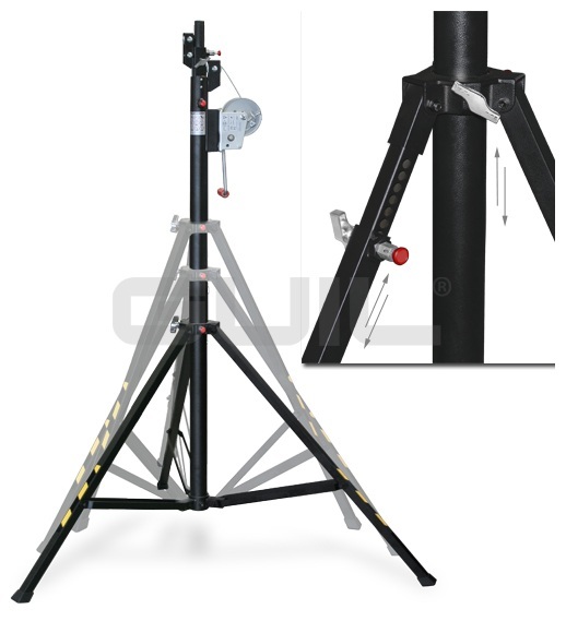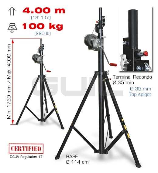 Compact telescopic lifting tower, specially designed for easy folding. It is certified for lifting loads up to 100 kg up to a maximum height of 4.00 meters and has a Ø 35 mm upper bolt.