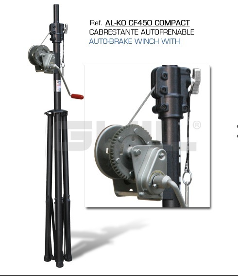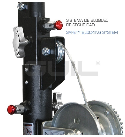 1.- It is equipped with a manual winch with an automatic brake system. Its automatic block system ensures that the load remains in position every time the handle is released.