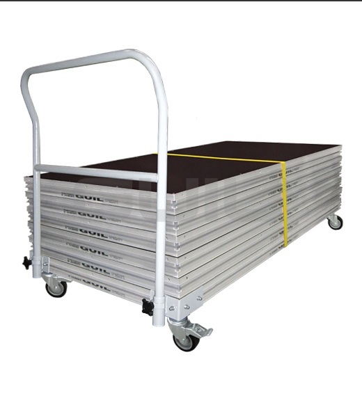 This practical kit allows you to convert a standard platform into a trolley / cart. It is perfect for hotels or auditoriums where small temporary stages are constantly set-up and removed.