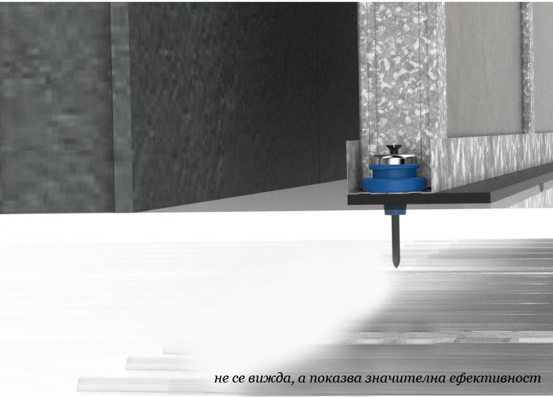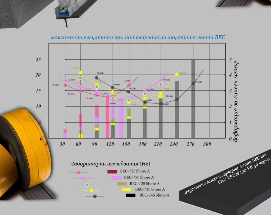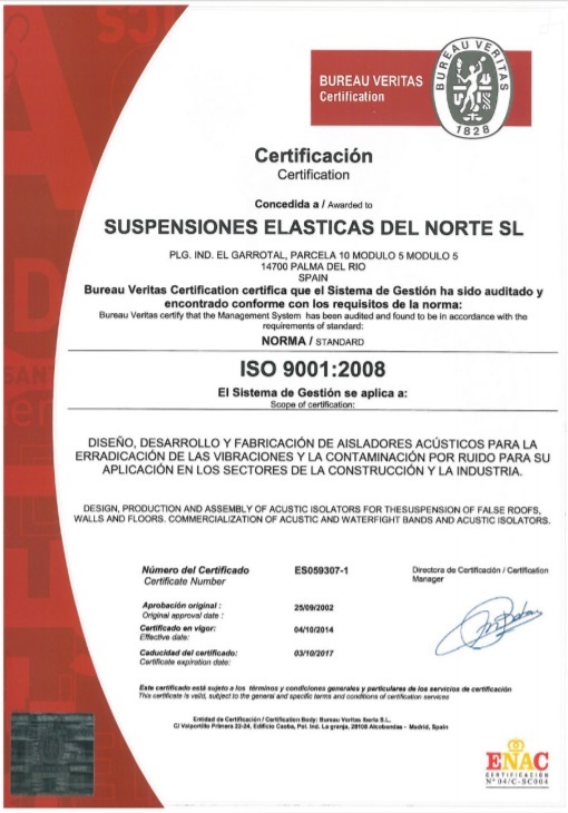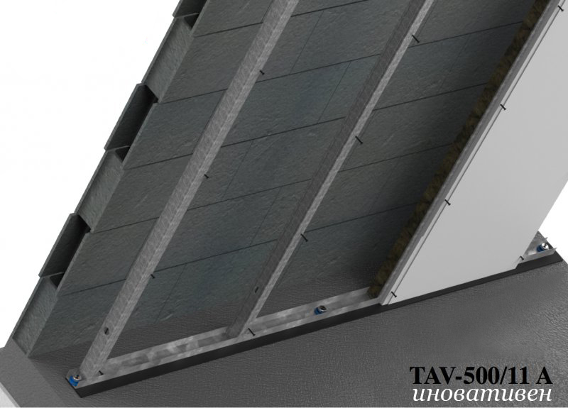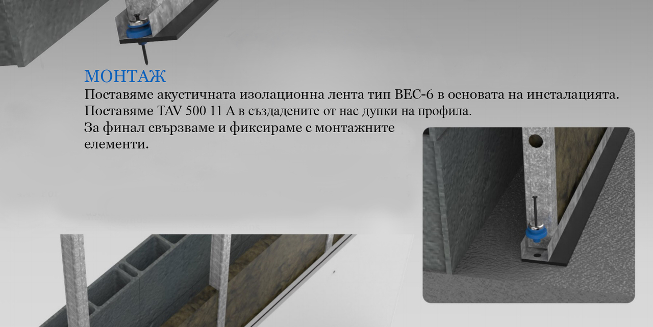 The metal part of the product is made of galvanized steel with 0.56 mm thickness and is composed from a vertical elements (studs) and horizontal elements (channels). The elastomeric isolator 500 TAV-11 is formed by high polymer "MEGOL IA 40 C UG / UVI AZUL FO85 / E P 1250SPE25", which is treated antioxidant.