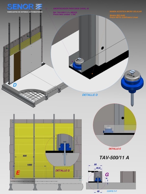 TAV-500/11 A is used for sound insulation of aluminum profiles, determining partitions and linings. Fixes and isolate structural aluminum profiles and skirting gypsum finishes.TAV-500/11 A is the elastic vibration isolators with maximum productivity, without doubt, to achieve completion should be combined with acoustic skirting tape of SENOR, type BEC or BEP and AMORIM.