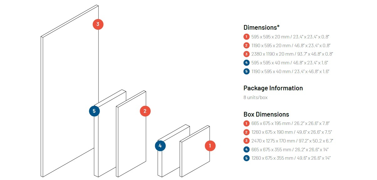 Възможни Размери: 595 x 595 x 20мм / 595 x 595 x 40мм // 1190 x 595 x 20мм / 1190 x 595 x 40мм // 2380 x 1190 x 20мм