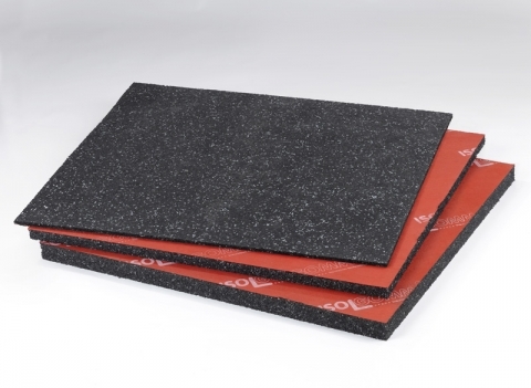 Антивибрационни еластомерни панели, изработени от EPDM и SBR каучукови влакна и гранули, съединени от поли-уретанов свързващ химикал, покрита с червен водоустойчив неразтеглив защитен материал.