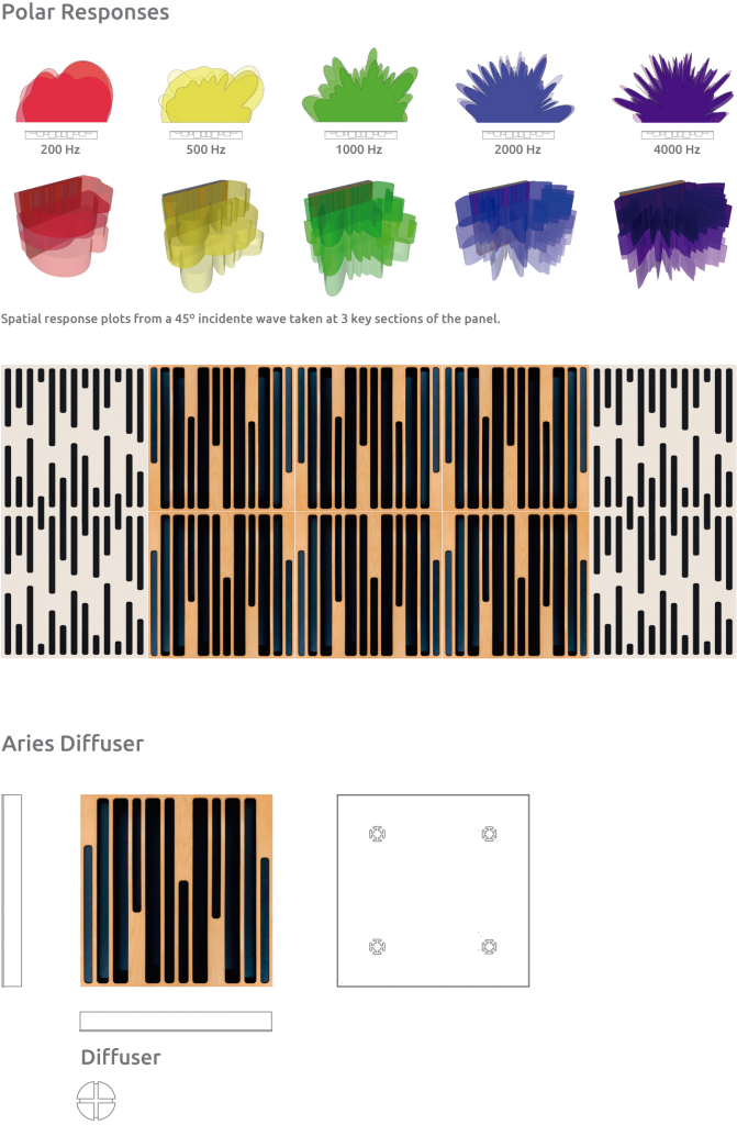 Въпреки че самият панел е с дебелина само 60 mm, разширените гнезда на дифузера са проектирани да бъдат ефективни при 160 Hz и 400 Hz, с линеен модел на дифузия от 700 Hz нагоре – осигурявайки на дифузера Aries нечуван капацитет на дифузия за неговия размер.