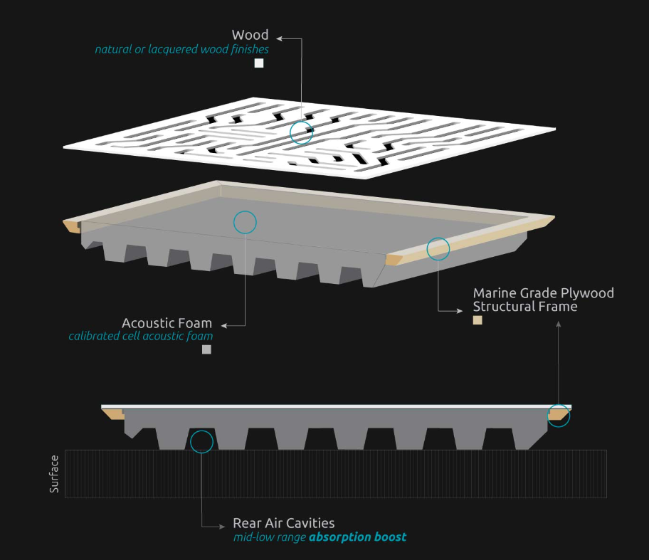 Акустичните панели Azteka са проектирани да намалят стоящите вълни и да предотвратят филтрирането им, като драстично подобряват яснотата на речта. Производителността на Azteka започва от 315 Hz и предлага ефективно и равномерно усвояване до 3150 Hz.