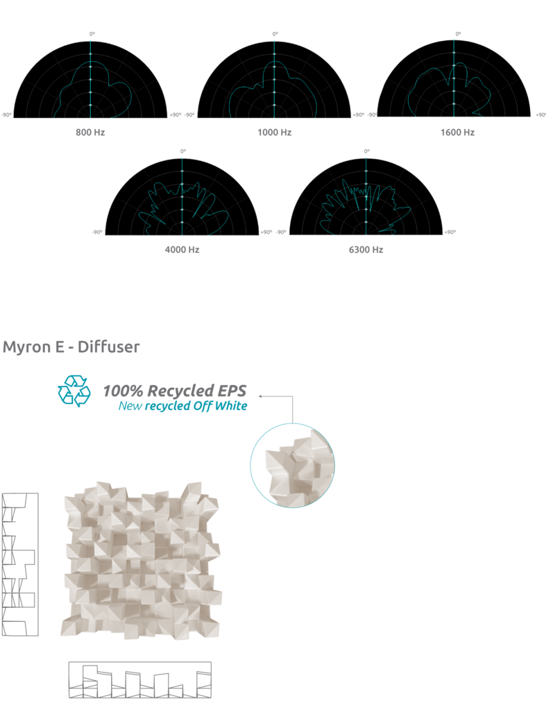 В помещения като контролни стаи за запис, стаи за мастериране на звука или други среди с висока прецизност на слушане, където качеството на звука е критично, контролирането на честотната лента на дифузията е приоритет. Myron E Дифузер е замислен и разработен от Artnovion със специфично техническо предимство, което му позволява да работи много повече от това, което повечето други продукти за разсейване на звука могат да осигурят.