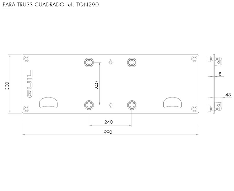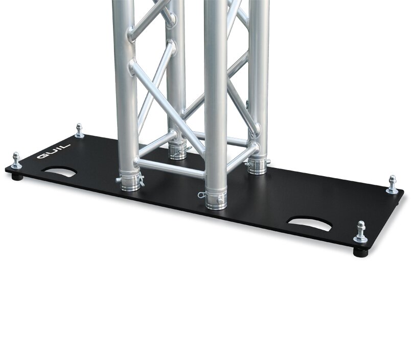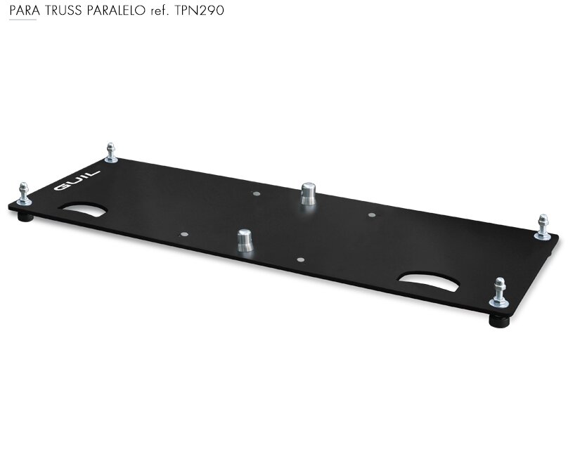 Основа с нивелири, предназначени за квадратни ферми 290 x 290 мм (реф. TQN290) и паралелни ферми 290 мм (реф. TPN290). Изработена от стомана 990 x 330 мм с дебелина 8 мм (черно покритие), с дръжка за лесно транспортиране и заоблени ръбове за предотвратяване на повреди. Доставя се в комплект с необходимите фитинги за монтаж: 4 комплекта плътни алуминиеви конектори (реф. UTR-06), които гарантират бързо и сигурно закрепване.