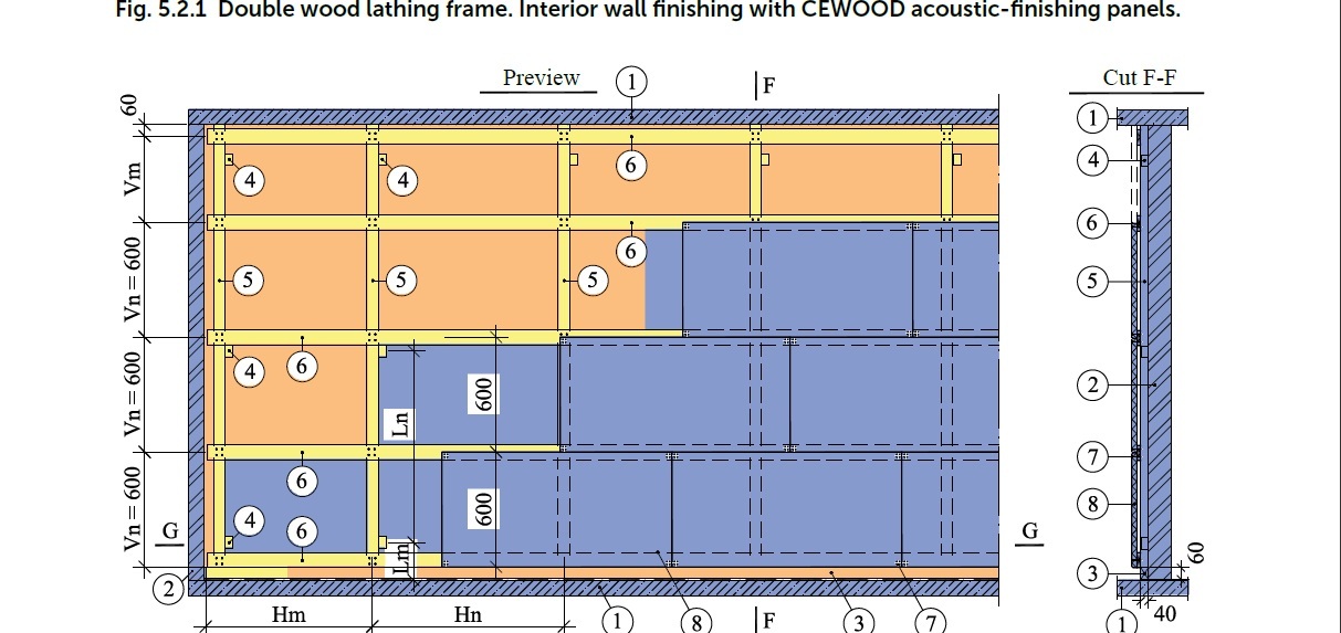 За монтиране на стена се използват панели с дебелина 25, 35 и 50 мм. Панелите CEWOOD се закрепват върху дървена летва или стоманена профилна рамка. Има няколко вида рамкови конструкции. Производителят на рамкови елементи дава препоръки и определя приложението. Видът на структурата на рамката и закрепването върху съществуващите стената зависи от: