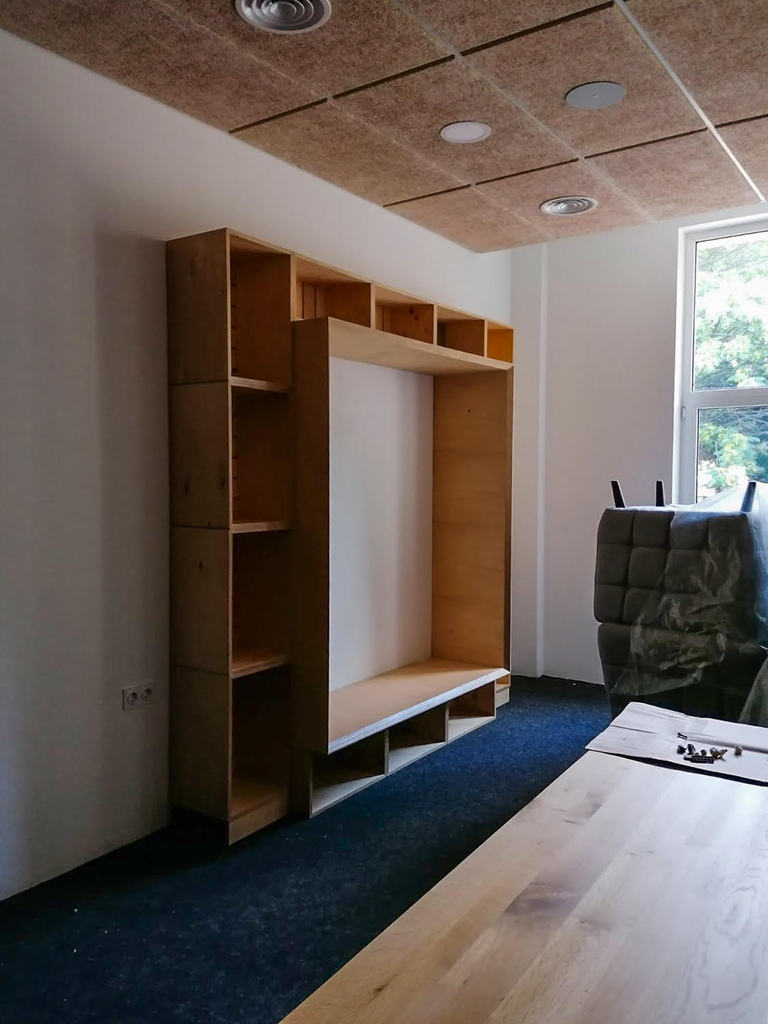 -монтажни летви, закрепени върху носещи летви, върху които са прикрепени акустични панели CEWOOD.