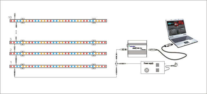 Описание: DMX digital bar използва 32 бр SMD RGB 5050 светодиоди за да осигури ясно и перфектно смесване на светлинния лъч. С контролер на LED spektar и софтуер на Madrix може да се постигнат ефекти като избледняване, прескачане, сканиране и преследване на цвета, показване на видео файлове и графики.