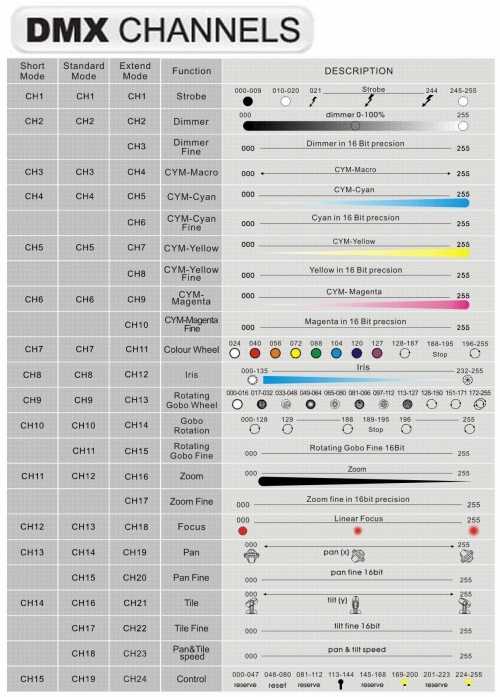 DMX канали: Краткък режим: 15, Стандартен режим: 19, разширен режим: 24 канала