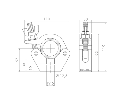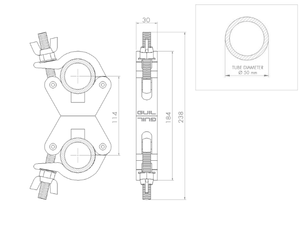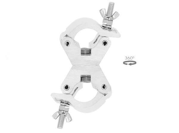 Алуминиева двойна въртяща се скоба (въртяща се на 360º), специално проектирана за тежки товари (500 кг). Проектиран за използване върху ферми / тръби с външен диаметър от 45 до 52 мм.Неговата гъвкавост осигурява сигурно закрепване на две тръби в различни позиции: съседни, перпендикулярни, успоредни тръби и т.н. Необходима е когато мястото на тръбата, където трябва да се монтира съединителя, е ограничено.Този здрав многофункционален скобен съединител се използва в различни области: развлекателна индустрия, театър, строителство и др. Двойния въртящ се съединител ref. ABZ-30 съчетава здравина и издръжливост с високо ниво на безопасност.Чрез отстраняване на съединителния винт M12 те могат да се използват като независими скоби и след това могат да се добавят други завършвания, като например гайка или болт и крилна гайка (след това реф. ABZ-34 / Ref. ABZ-35) за други функции.