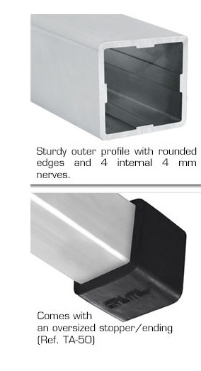 Описание:Стандартните крака с квадратни профили от 50 x 50 mm са произведени с екструдиран алуминий (Алуминиева сплав: EN-AW 6082 T6). Тези сменяеми крачета са снабдени със специални немаркиращи се нехлъзгащи се терминали, които гарантират пълно регулиране на всяка повърхност.