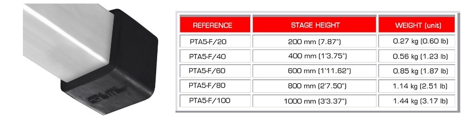 Описание:Стандартните крака с квадратни профили от 50 x 50 mm са произведени с екструдиран алуминий (Алуминиева сплав: EN-AW 6082 T6). Тези сменяеми крачета са снабдени със специални немаркиращи се нехлъзгащи се терминали, които гарантират пълно регулиране на всяка повърхност.