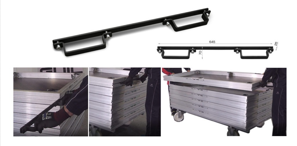 Описание:Комплект дръжки за от двете страни на сченичен подиум(практикабъл), така че двама души да се улеснят и подпомогнат при преместването и съхранението му.