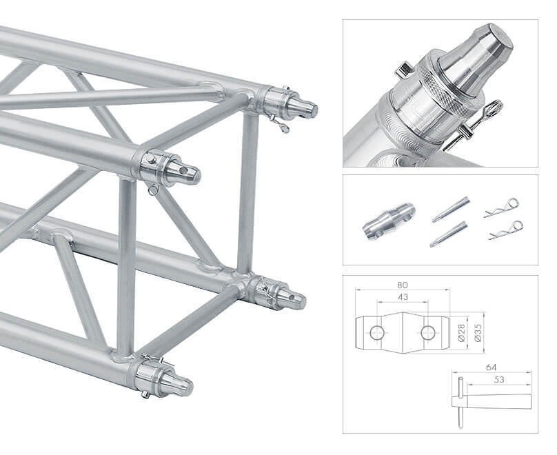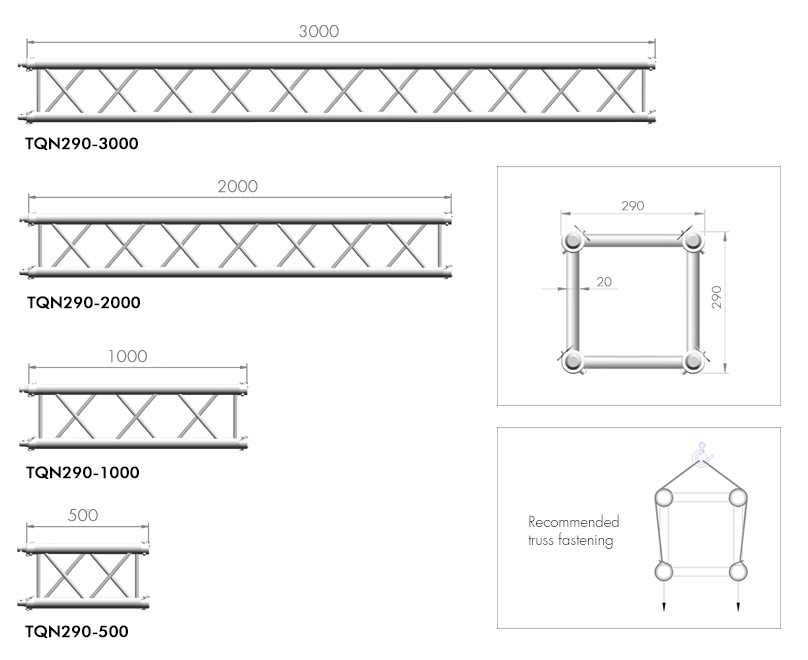 Описание: Алуминиева квадратна ферма с размери 29 x 29 cm със система за бърза връзка, изработена от екструдирана алуминиева тръба (сплав: EN-AW 6082 T6) и TIG заварена, за да гарантира максимална здравина и надеждност. Връзката с квадратна ферма TQN290 е направена с помощта на съединителна система UTR-10, съставена от здрав алуминиев коничен съединител, заключващи щифтове (шипове) и предпазни R-пружини, което позволява бърз и надежден монтаж. Всяка ферма се предлага в комплект с включената съединителна система (4 x UTR-10: 4 двойни конични съединителя, 8 заключващи щифта и 8 предпазни R-пружини). Kвадратна ферма на Guil може да бъде боядисана във всеки цвят, който желаете, с прахово покритие. TQN290 Квадратна ферма, макар и лека, комбинира здравина с гъвкавост; използва се както за архитектурни, така и за декоративни функции. Тези характеристики гарантират максимална безопасност, надеждност и дават визуално привлекателно решение за много приложения