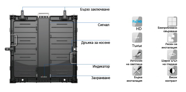 Описание: LED SPEKTAR LTD използва за своите външни и вътрешни рентал инсталации кабинети с корпуси от лят алуминий които са супер тънки и леки с двустранна степен на защита IP65. Имат бързо заключване което улеснява бързия и лесен монтаж и спестява разходи за инсталиране.Тези кабинети поддържат всички мултимедийни формати. Новия дизайн позволява директна настройка и калибриране на яркостта за високо качество на картина с лице директно към слънцето. Идеален за търговски центрове, супермаркети, болници, банки, изложения, хотели, летища, спортни съоръжения, TV формати и други мулти функционални пространства.