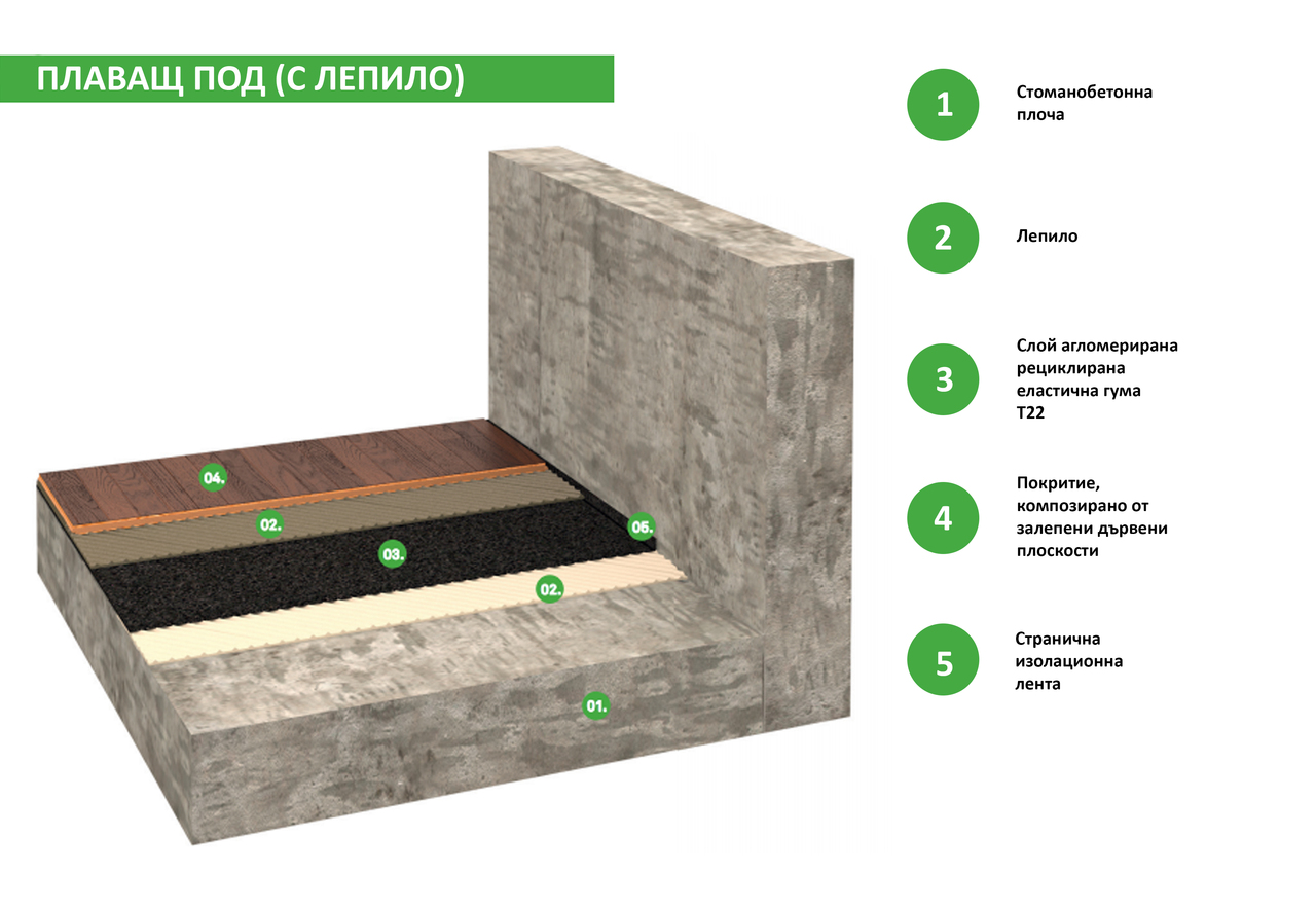 Приложение: За намаляване стойностите на ударен и въздушен шум при полагане на финишен под от държени настилки.
