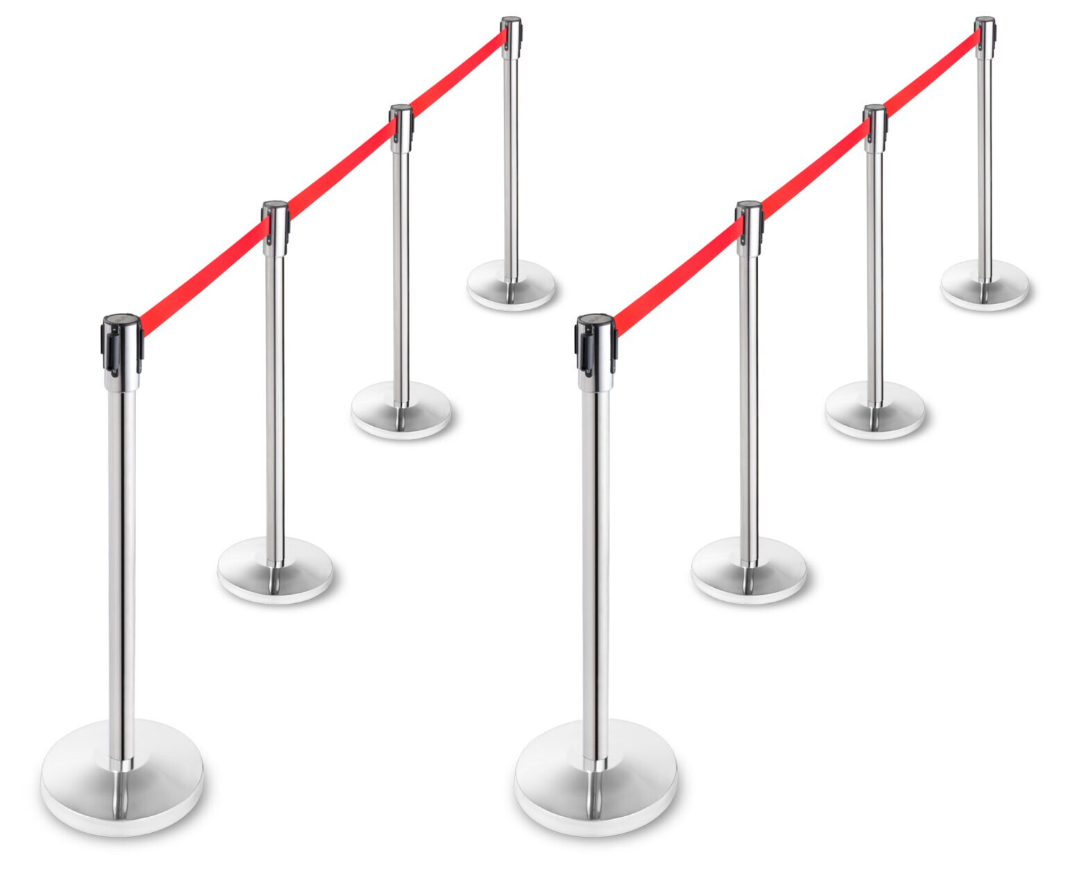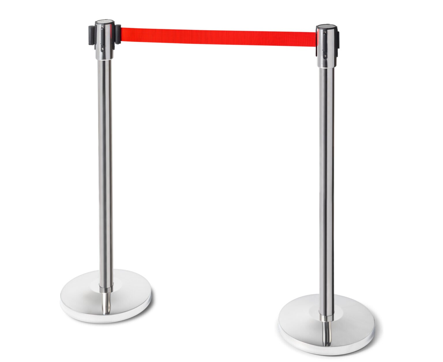 Система от бариери от неръждаема стомана с 3-метров червен прибиращ се колан, проектирана като система за насочване на обществеността или за разделяне или ограждане на пространства.